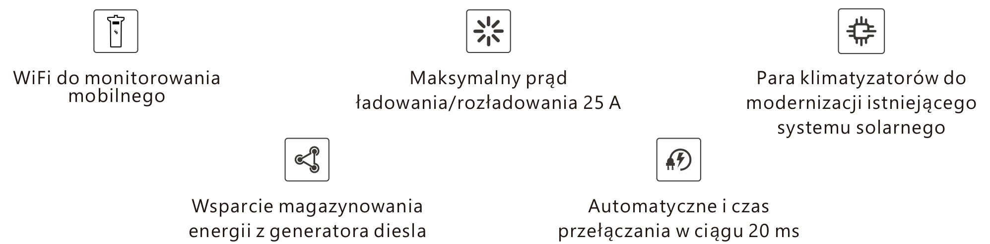 Magazynowanie energii Kompatybilność z akumulatorami wysokonapięciowymi umożliwia efektywne przechowywanie nadwyżek wyprodukowanej energii, zapewniając jej dostępność w dowolnym momencie, nawet podczas awarii sieci.