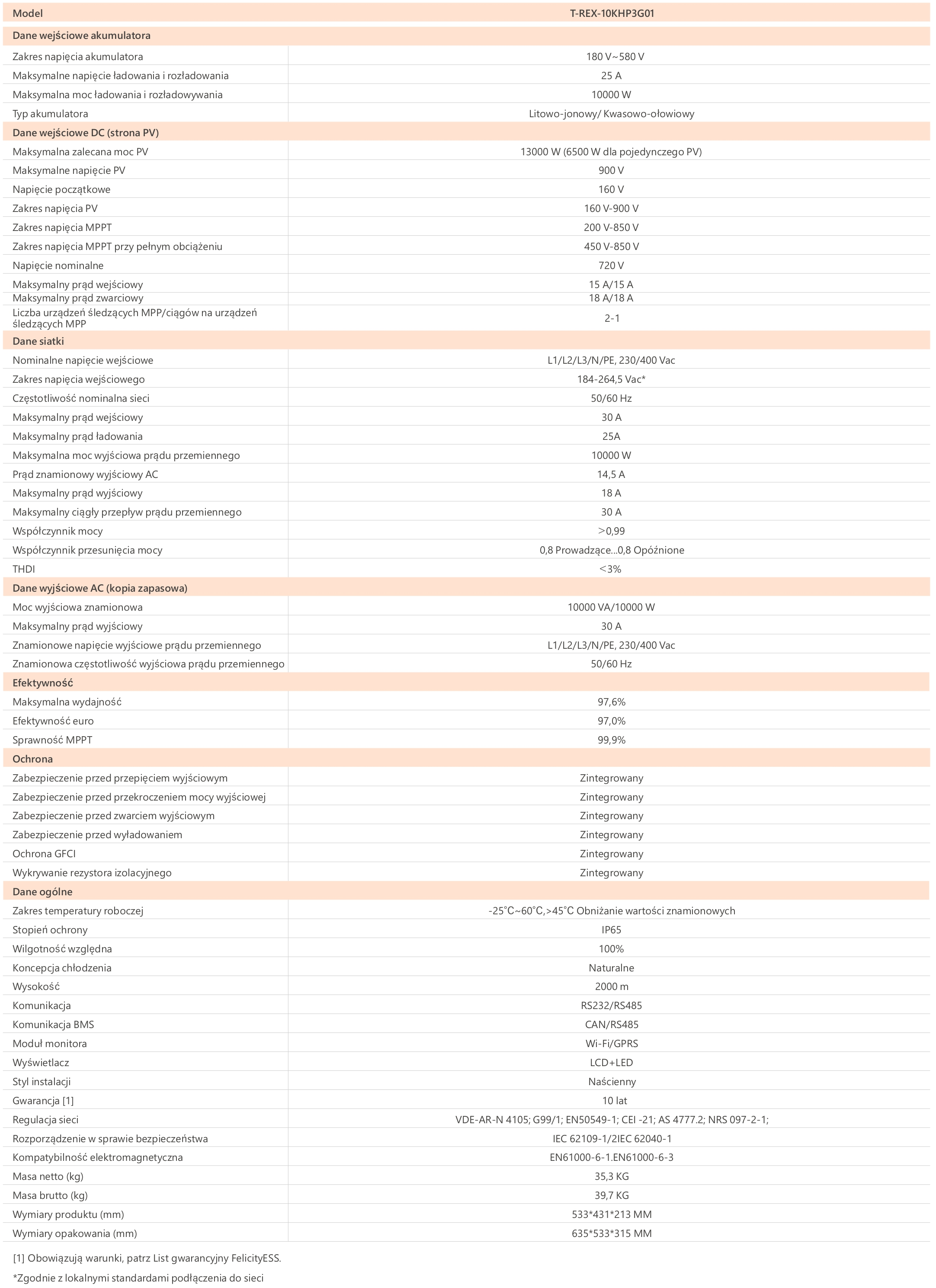 Firma FelicityESS od lat dostarcza rozwiązania, które łączą nowoczesną technologię z najwyższą jakością wykonania. Inwerter hybrydowy T-REX 10KHP3G01 to inwestycja w efektywność i niezależność energetyczną. Skontaktuj się z nami, aby dowiedzieć się więcej o tym produkcie i stworzyć system fotowoltaiczny dopasowany do Twoich potrzeb!